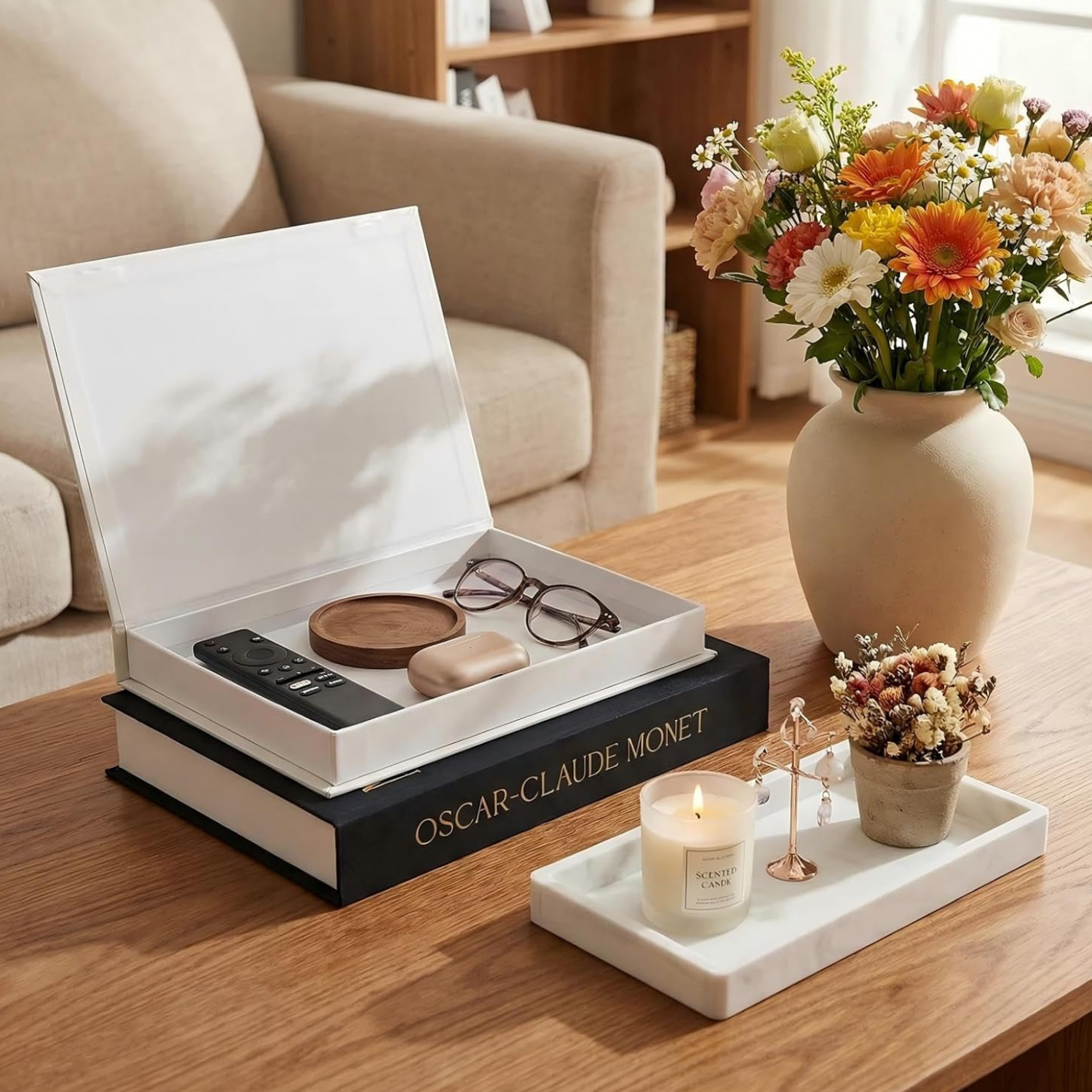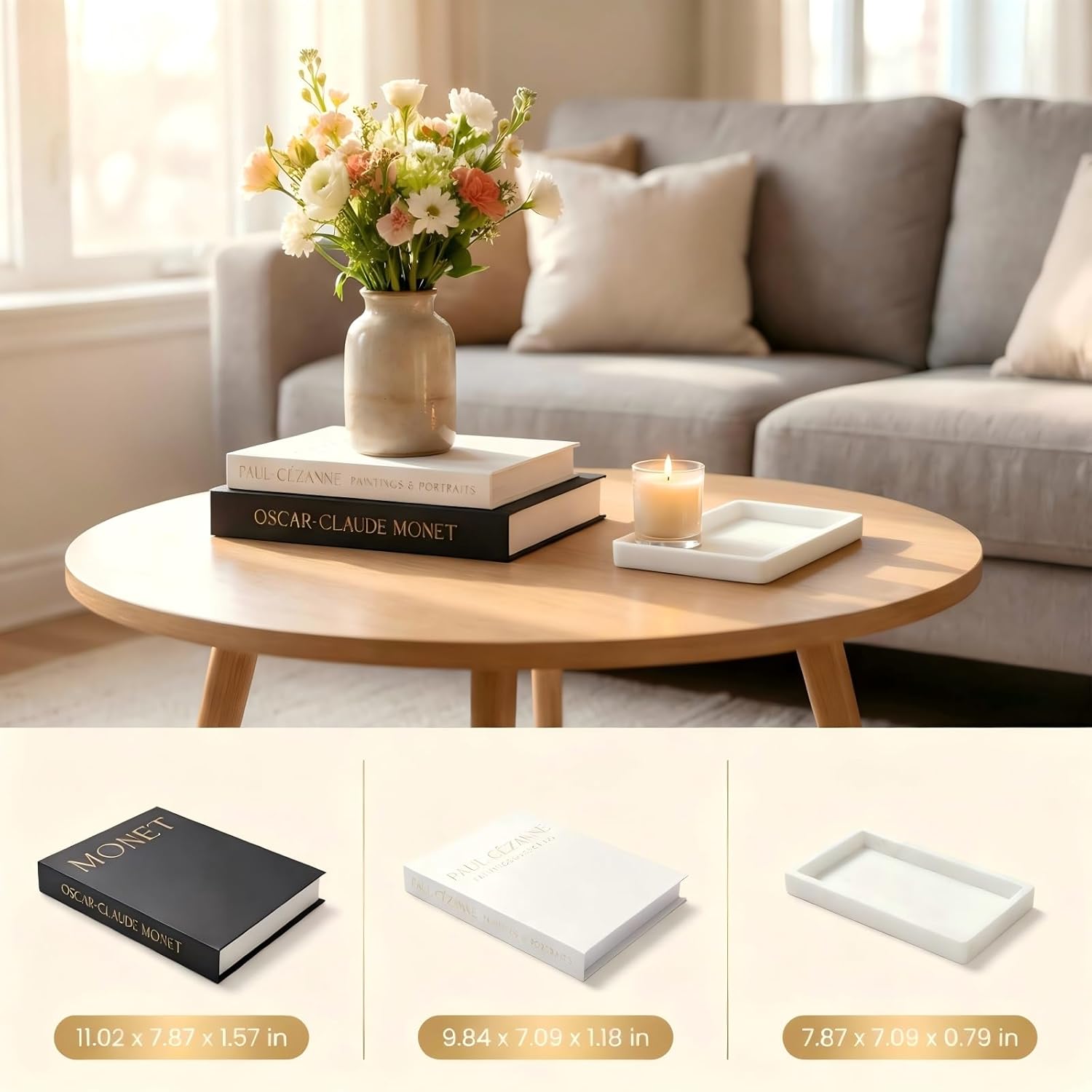 Instant Book Decor Upgrade: From Clutter to Class. Transform any room instantly. These are not just books; they’re premium fake books decor books designed with linen-textured covers and vintage detailing to add sophisticated, elegance style to your coffee table, bookshelf, or console. and a rectangular small tray that made of silicone imitating marble, which can be used for decoration and storage as well